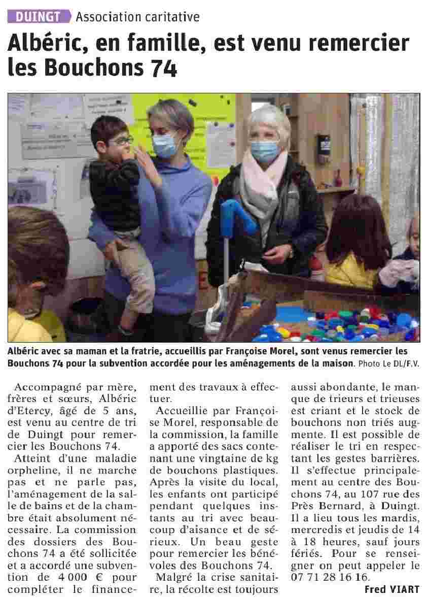 Article du Dauphiné Libéré en date du : 02/11/2020 ; DUINGT : Albéric, en famille, est venu remercier les Bouchons 74
