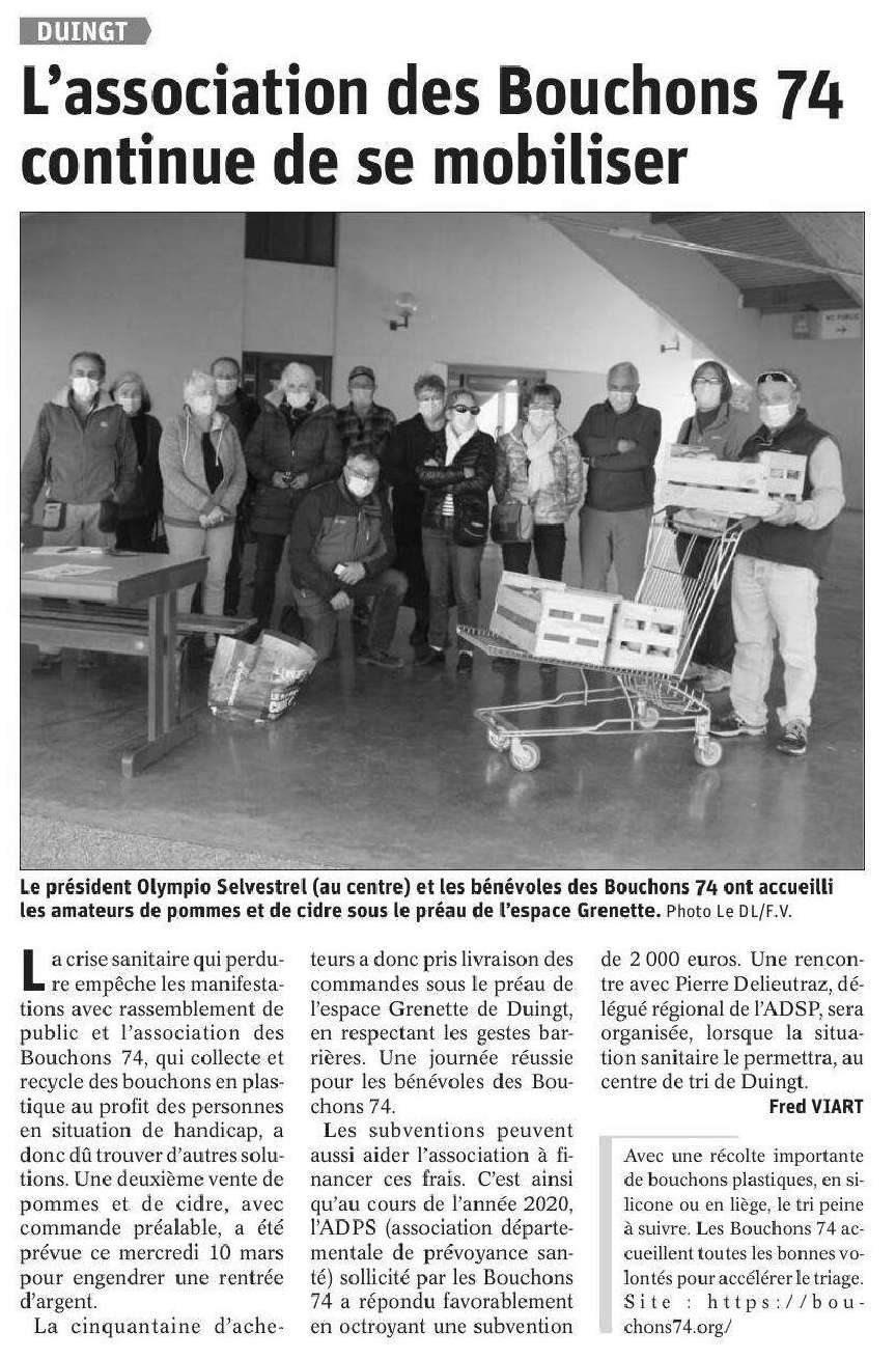 Article du Dauphiné Libéré en date du : 15/03/2021 ; DUINGT : L’association des Bouchons74 continue de se mobiliser