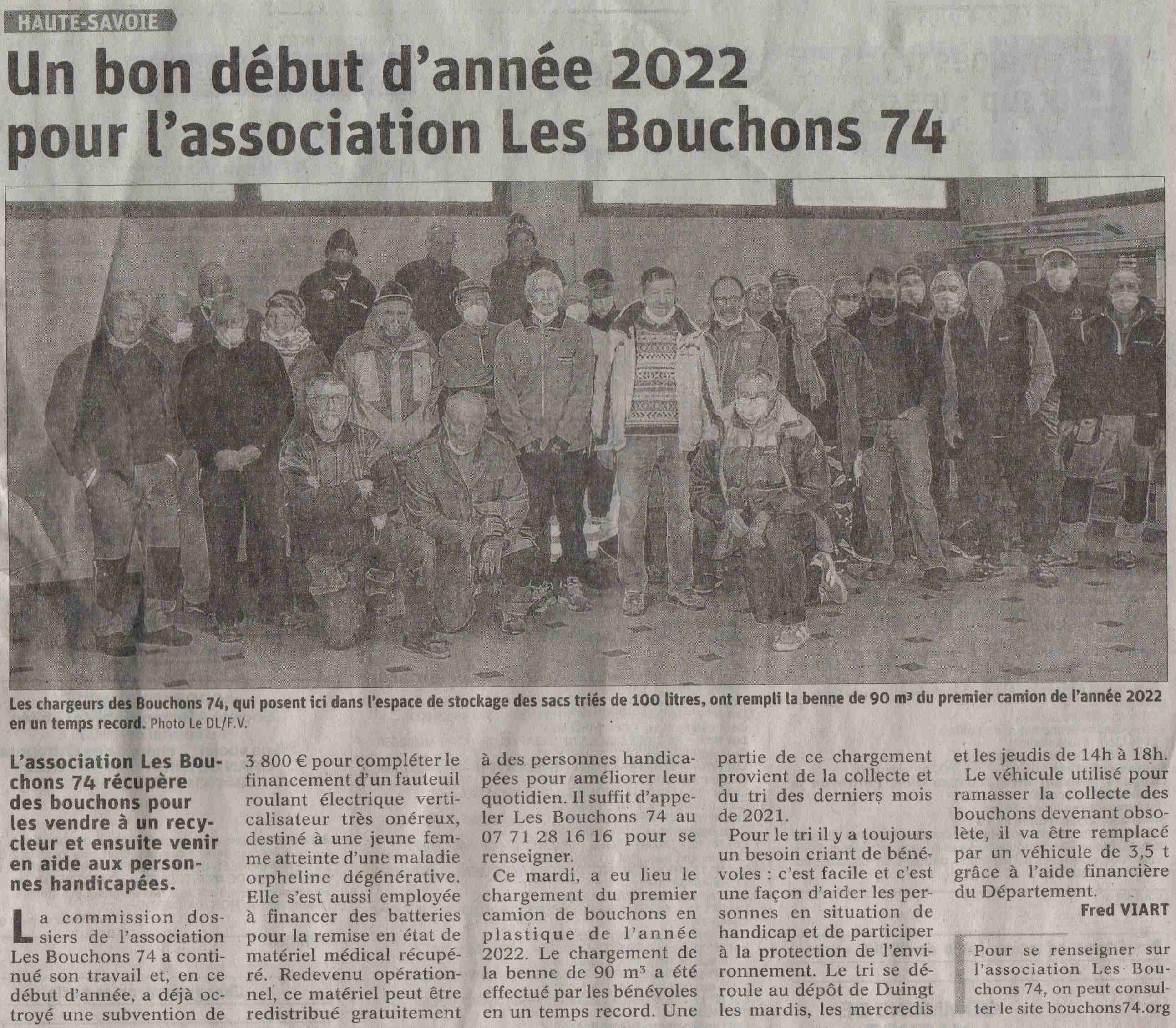 Article du Dauphiné Libéré en date du : 28/01/2022 ; DUINGT : Un bon début d’année 2022 pour l’association Les Bouchons 74