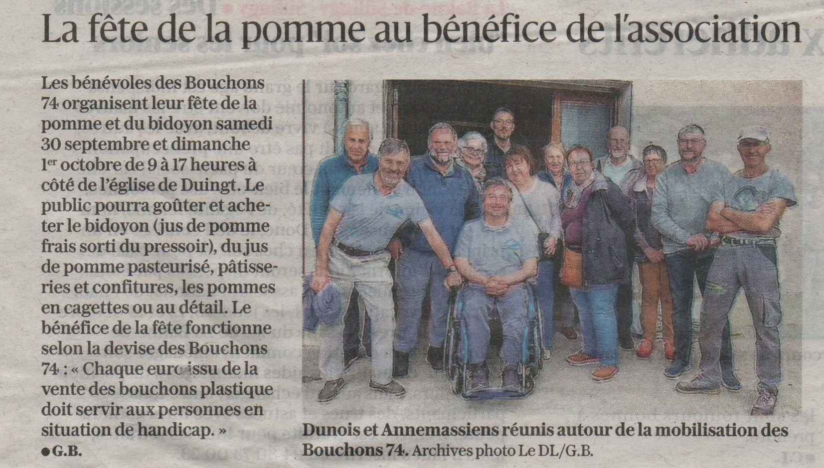 Article du Dauphiné Libéré en date du : 29/09/2023 ; Duingt ; La fête de la pomme au bénéfice de l’association