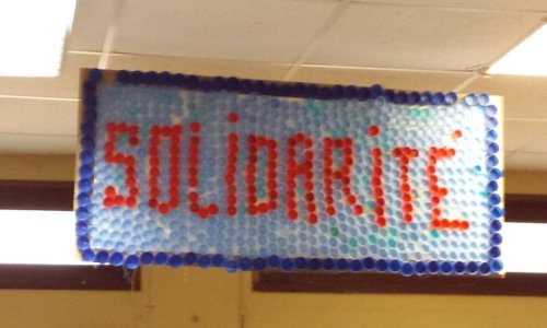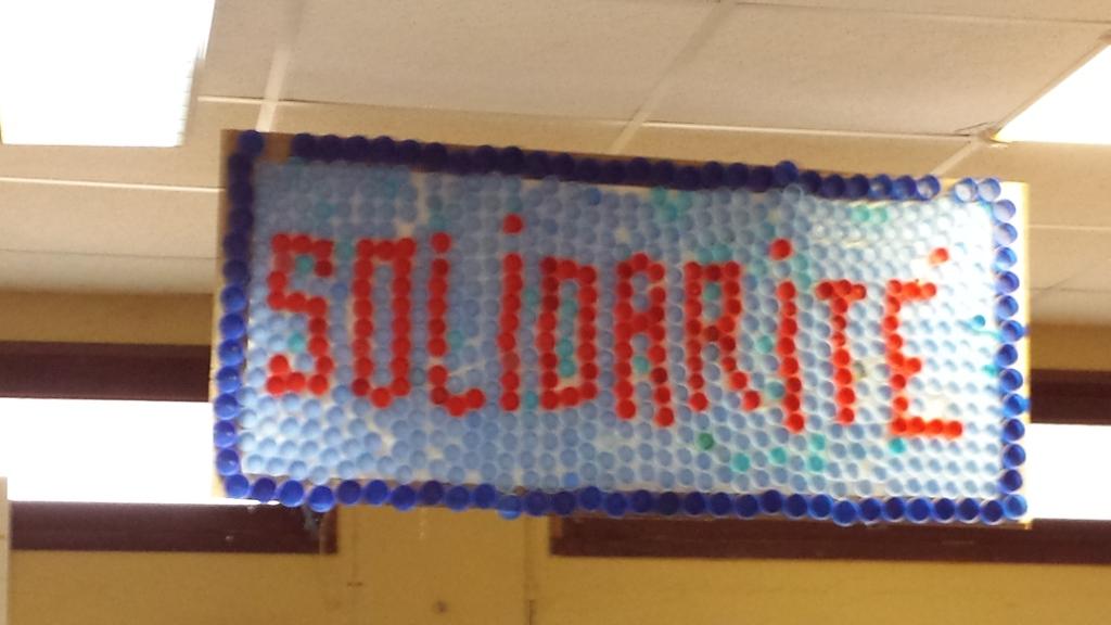- Une du panneau SOLIDARITÉ que nous a offert, il y a quelques années, une classe de la Jonchère de SEYNOD. Il est visible dans notre local de tri de DUINGT.
