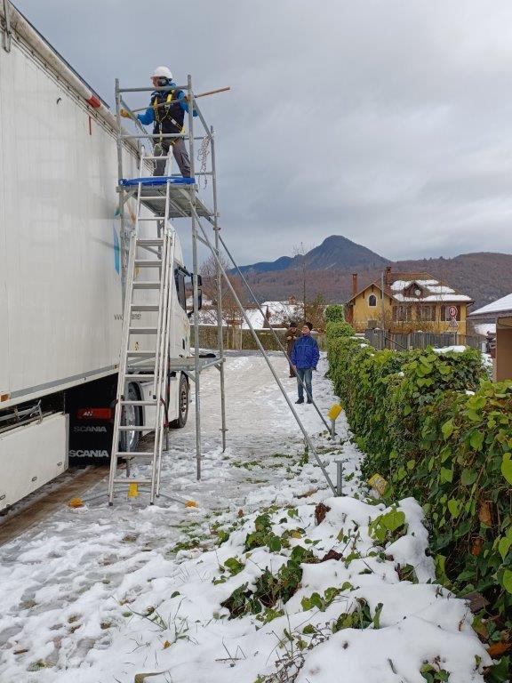 Heureusement, aujourd’hui, le chargement du camion se fait depuis l’intérieur du local… sauf pour Daniel MIEGE, qui du sommet de "la tour de contrôle" s’est pris une sacrée rincée ! Tout comme Jean-Claude JOSSERMOZ qui surveillait les opérations.