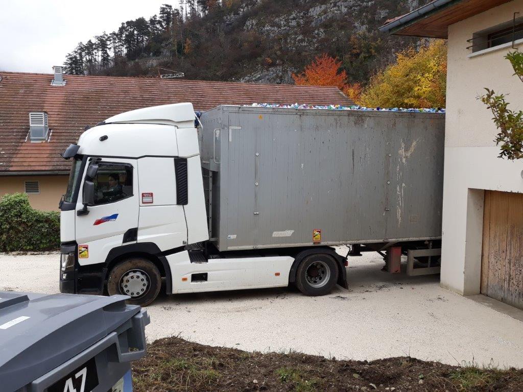 Nous attendions tous le camion pour 9 h, mais il est arrivé à 10 H 35’. Le temps qu’il se mette en position il a fallu attendre à 11 H pour le début de chargement (petite précision, il y avait aussi en plus le chantier en cours d’aménagement de la route des Prés Bernard).