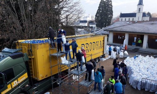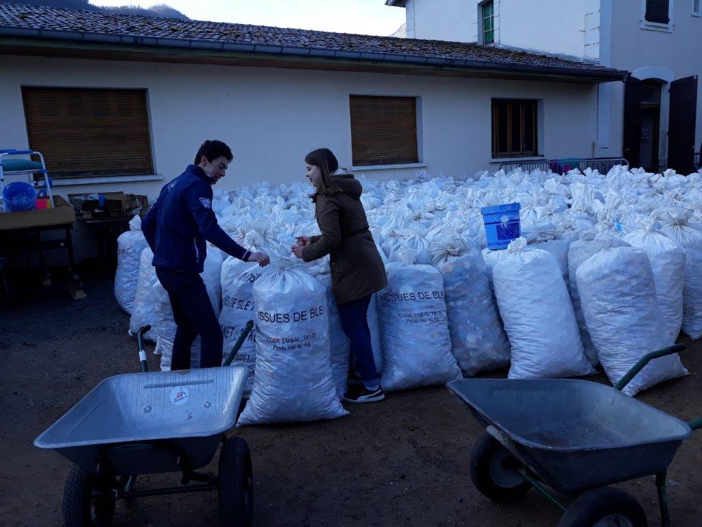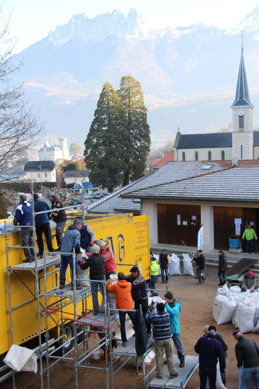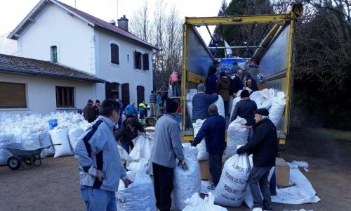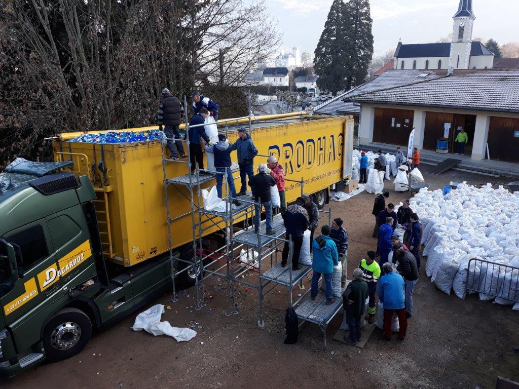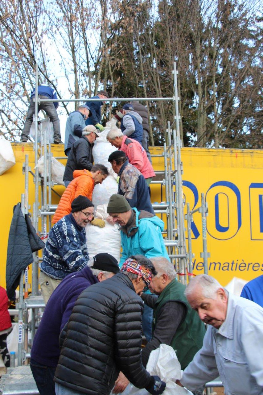 Pour pouvoir faire ces chargements, il faut des personnes qui donnent des bouchons, des points de collecte, des responsables secteur qui regroupent les bouchons, des patrouilleurs qui les ramassent et les apportent sur les locaux de tri, des trieurs-trieuses, des personnes qui font tout le travail dû au chargement, etc. etc.