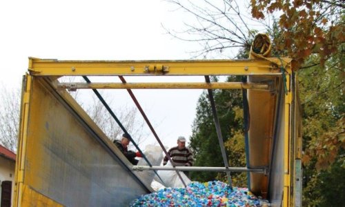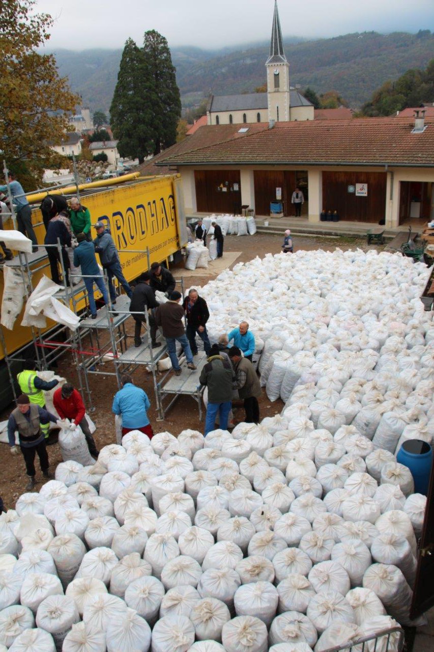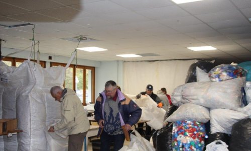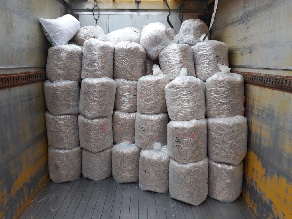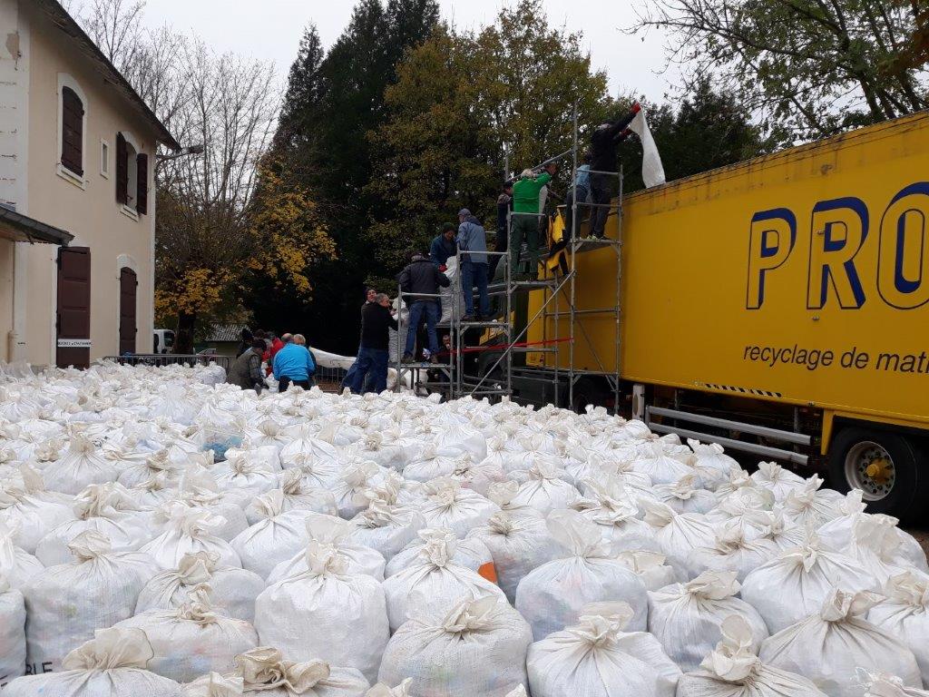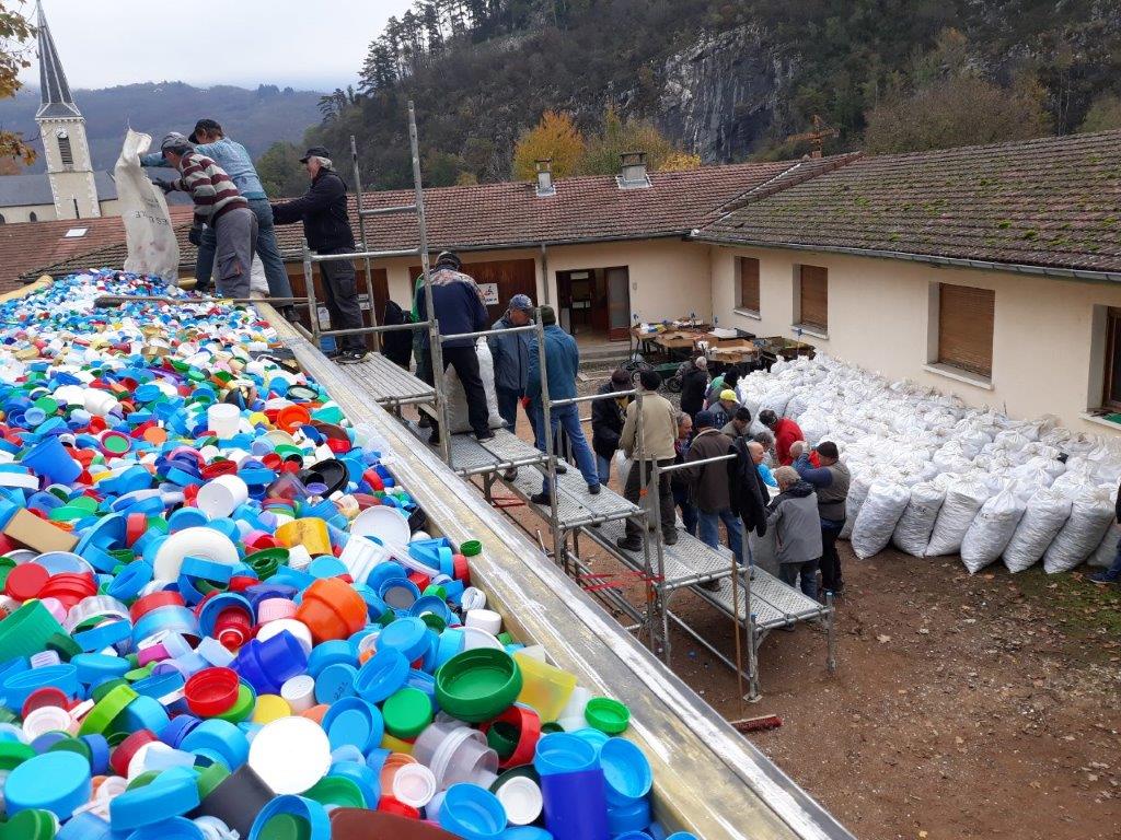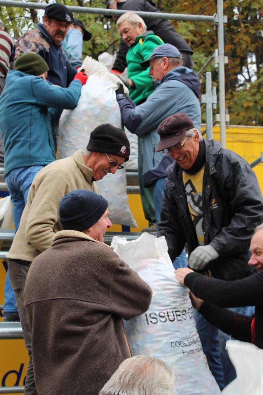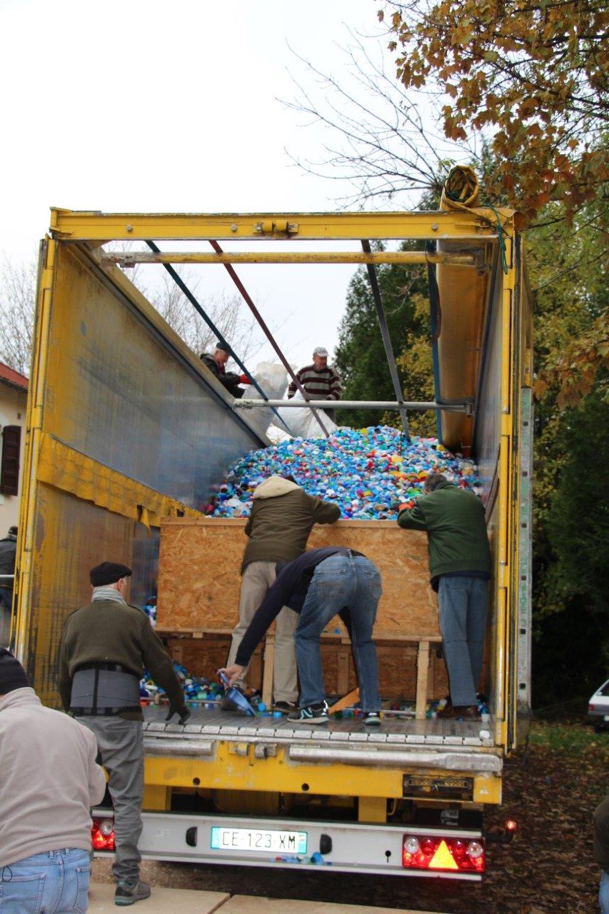 Vous remarquerez sur une des photos que nous commençons par charger les sacs de bouchons plastique "faux liège".