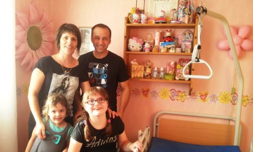 Photos de Mathilde, de ses parents qui nous remercient, ainsi que la photo de l’équipe d’amis qui nous a aidés à installer le lit dans sa chambre.