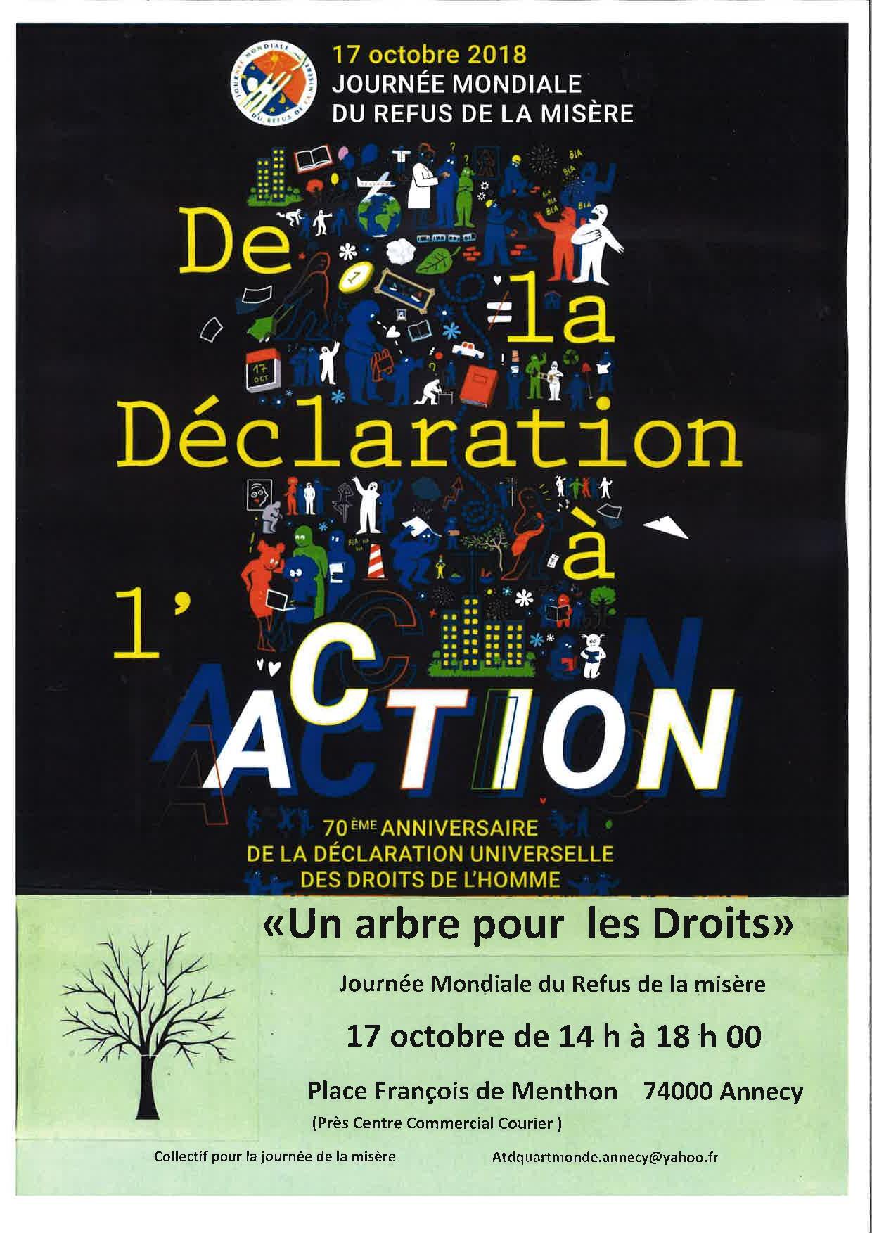 Veuillez trouvez ci joint l’affiche pour la journée du refus de la misère en Haute-Savoie. Cette année le thème de la Journée du refus de la misère marque le 70ème anniversaire de la Déclaration Universelle des Droits de l’Homme.