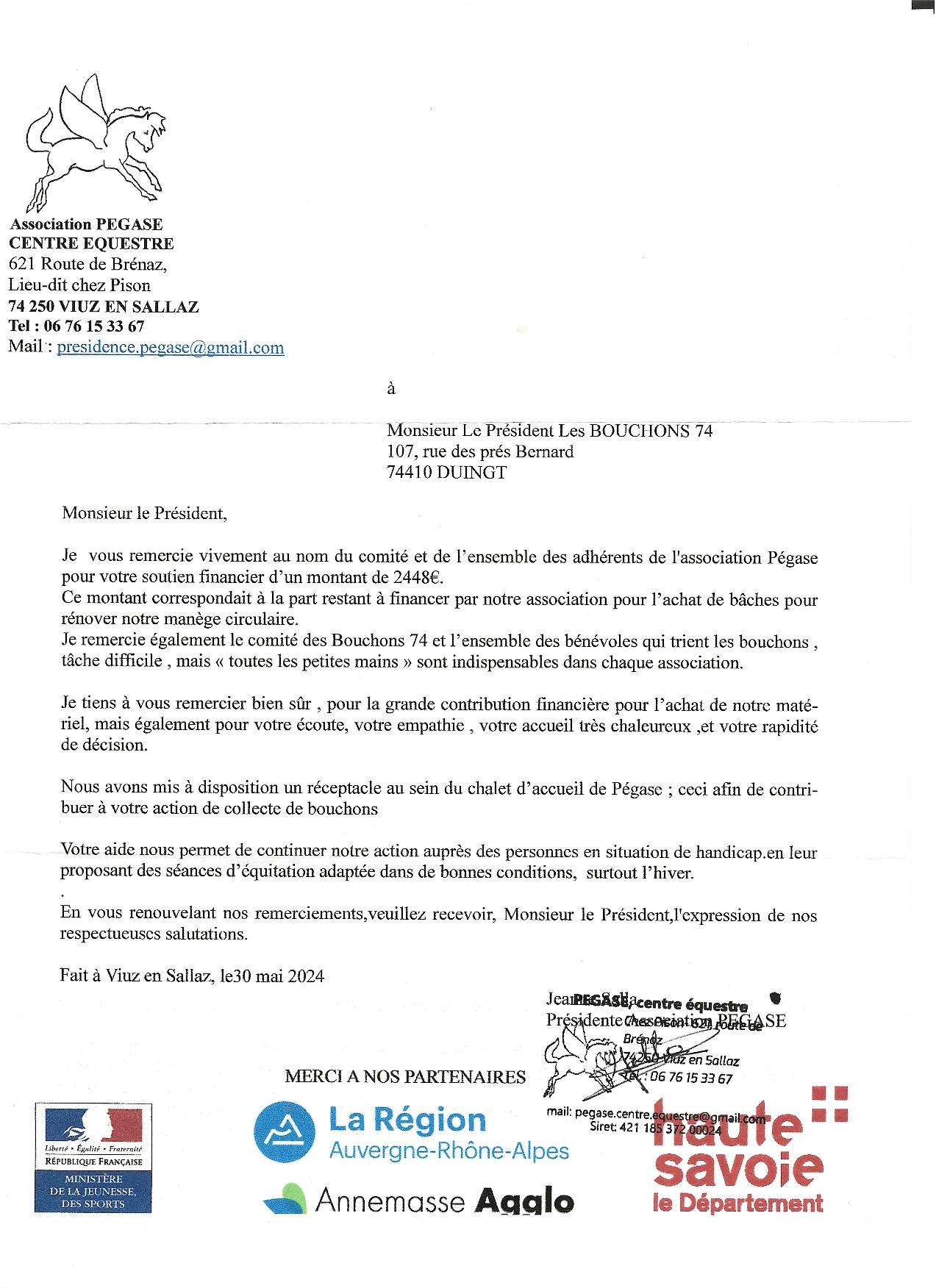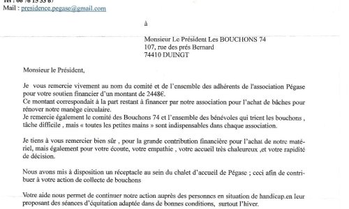 Nous avons fait une action d’aide financière à cette association. Celle-ci nous remercie pour cet aimable courrier.