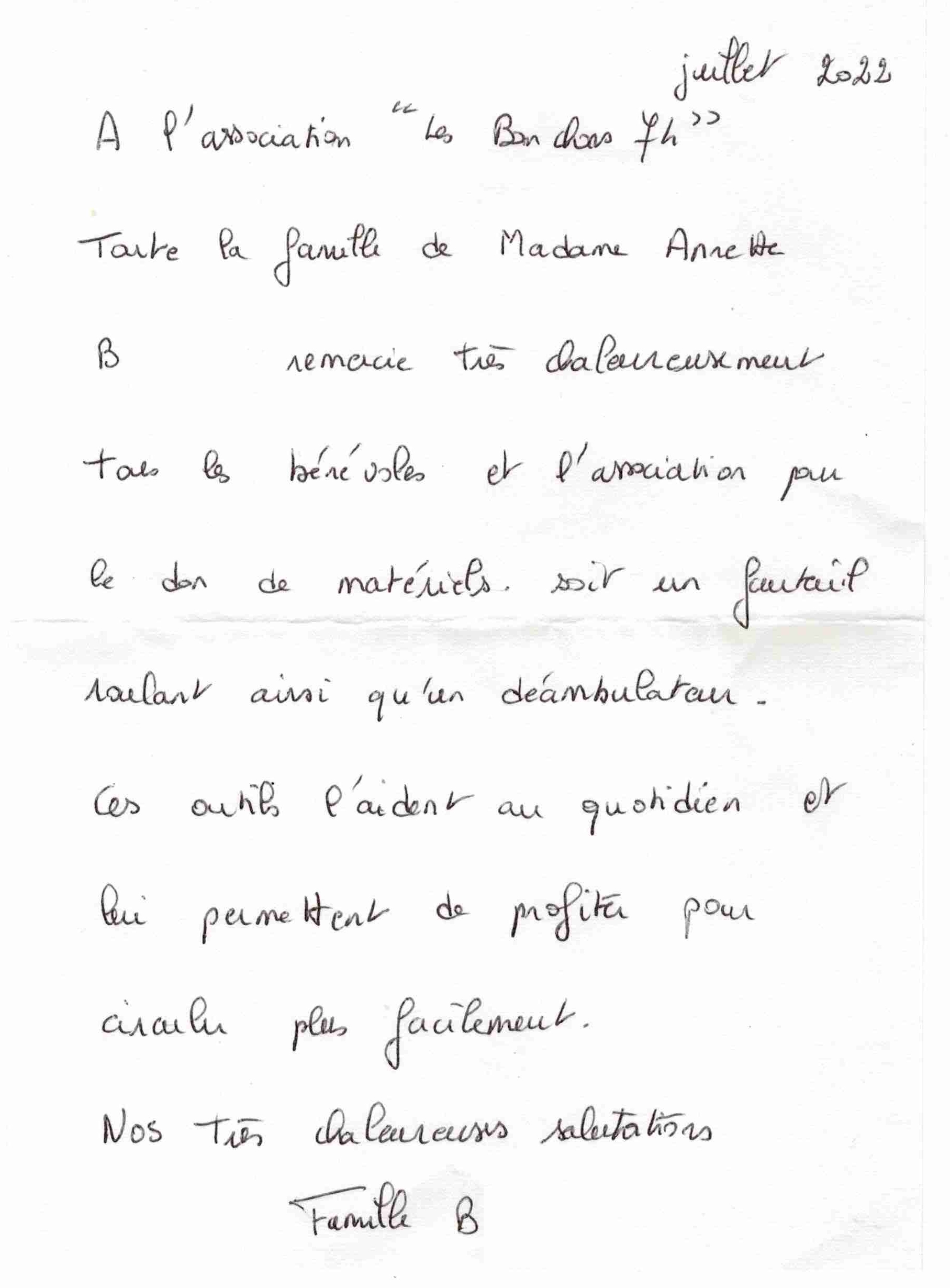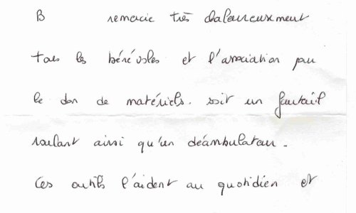 Remerciements reçus par Hélène, notre responsables dons de matériels.