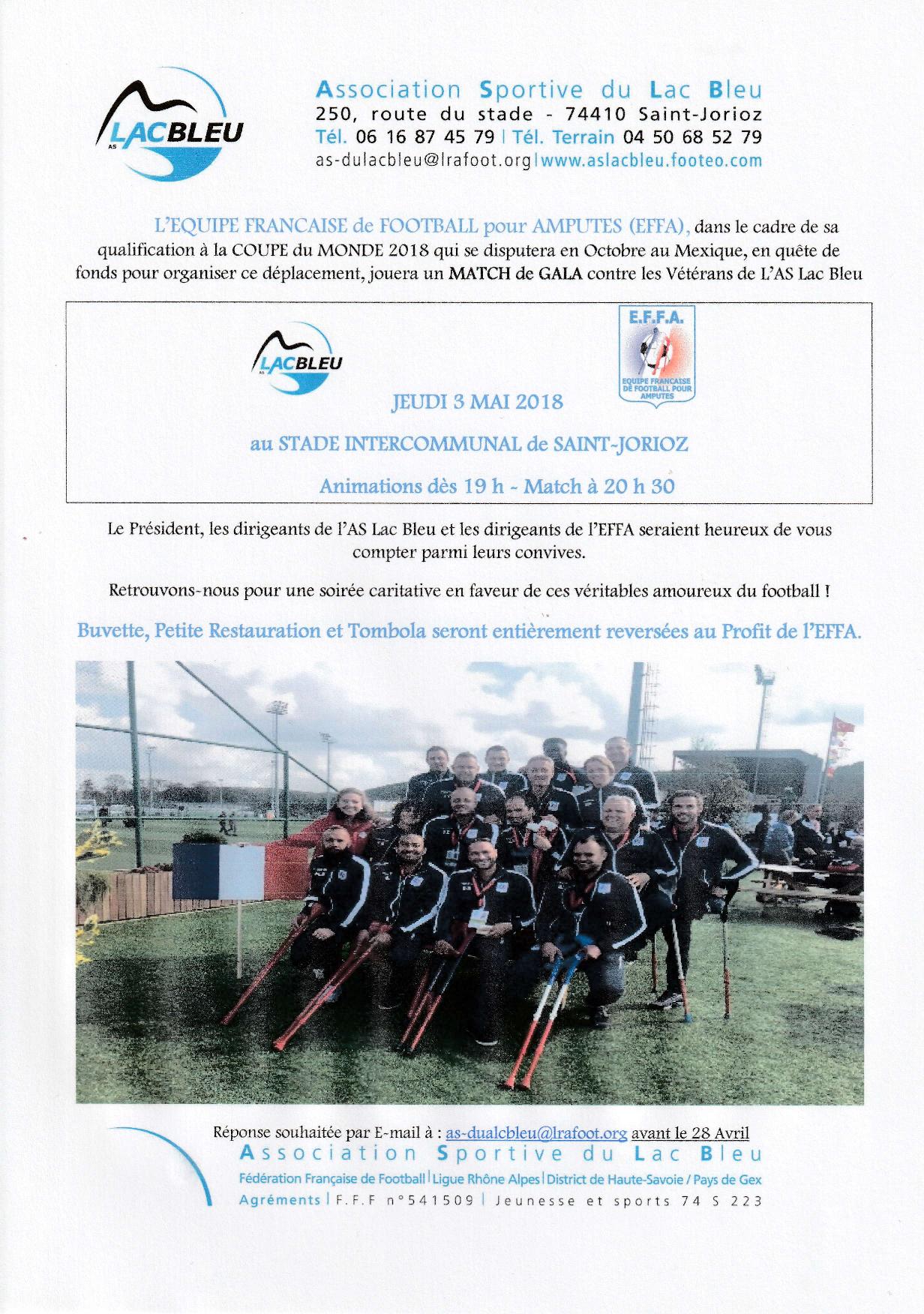 Je me permets de vous transmettre une invitation pour venir assister à un événement le jeudi 03/05 en soirée au stade intercommunal de SAINT JORIOZ : l’AS LAC BLEU accueille l’équipe Française de FOOTBALL pour Amputés (EFFA), lors d’une rencontre amicale avec notre section VETERANS.