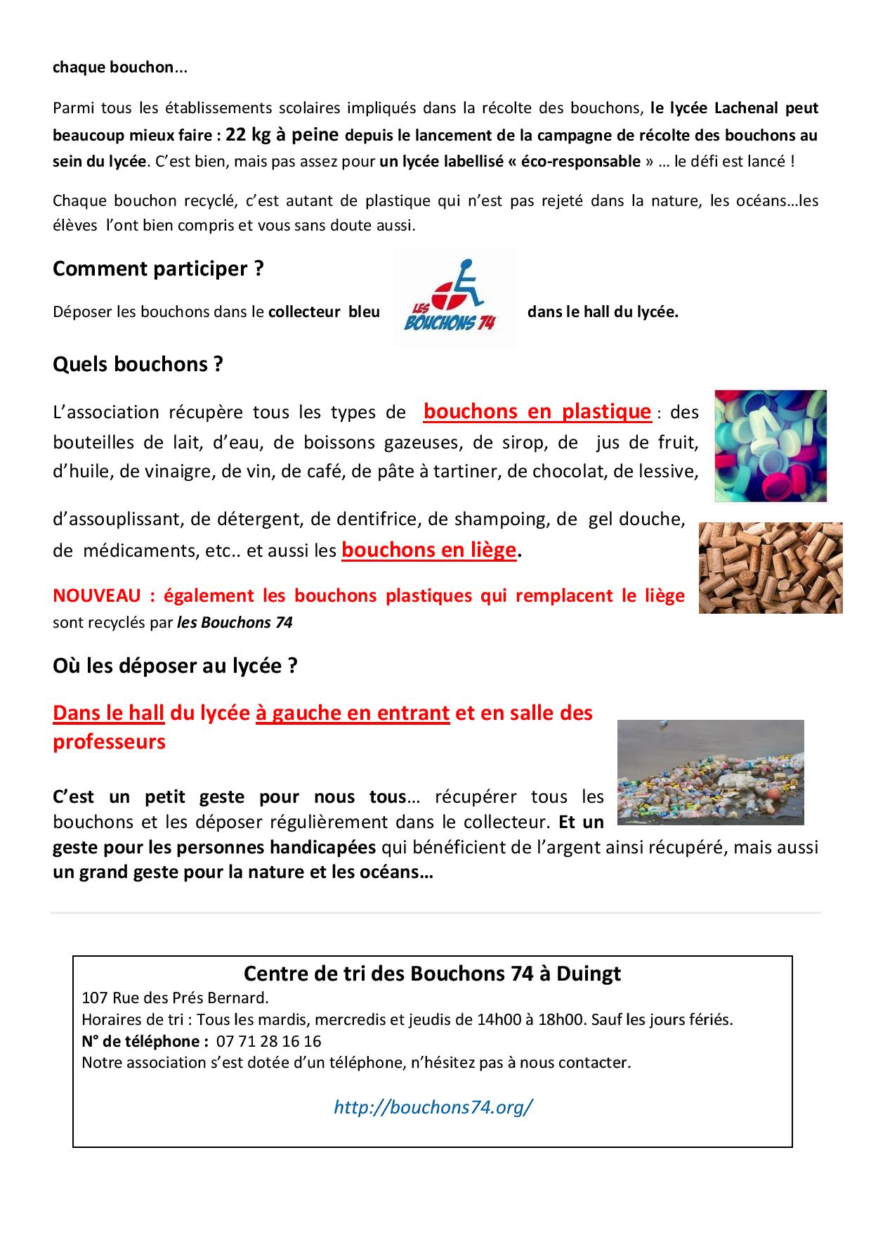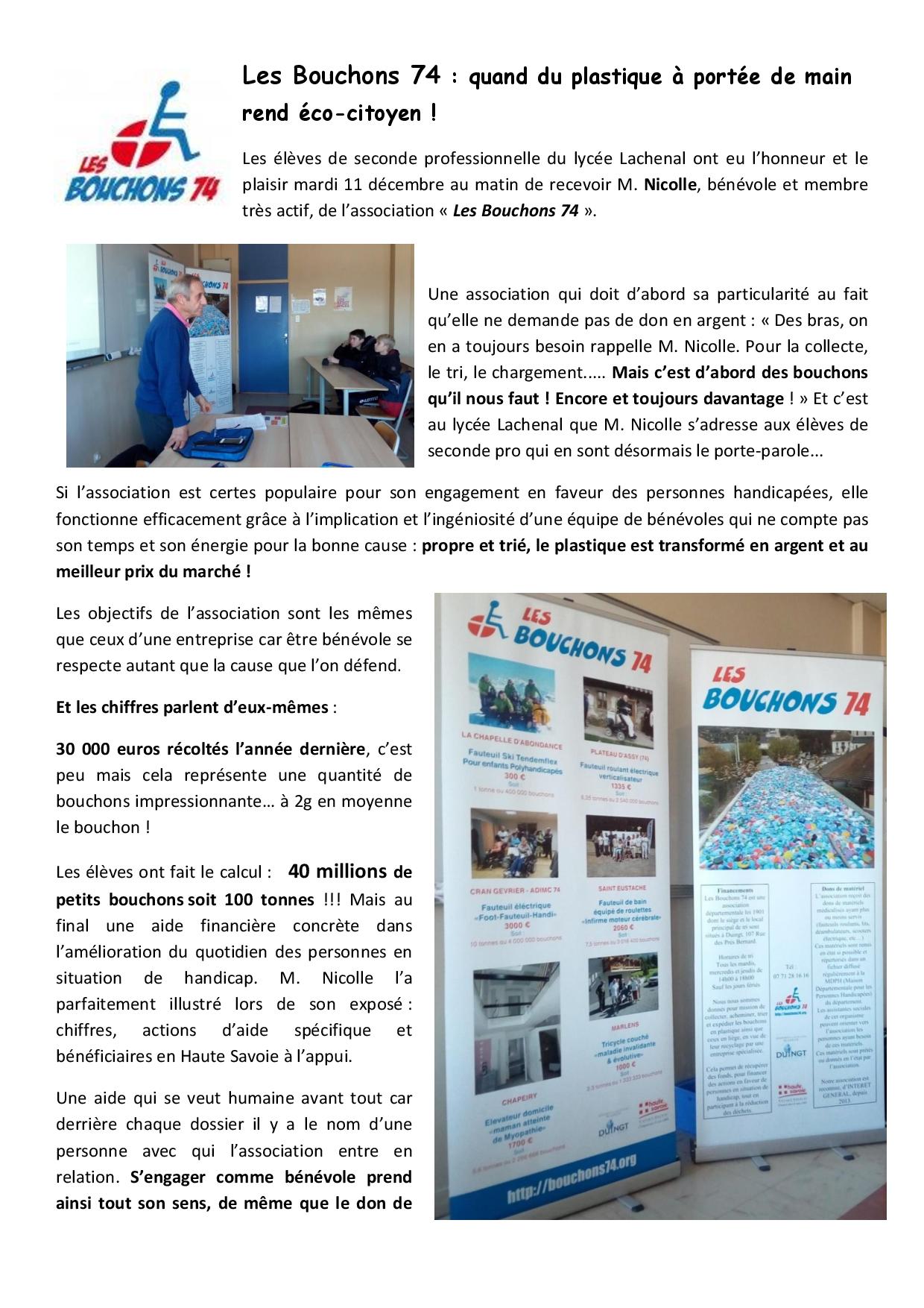 Les Bouchons 74 au Lycée Louis Lachenal d’ARGONAY.