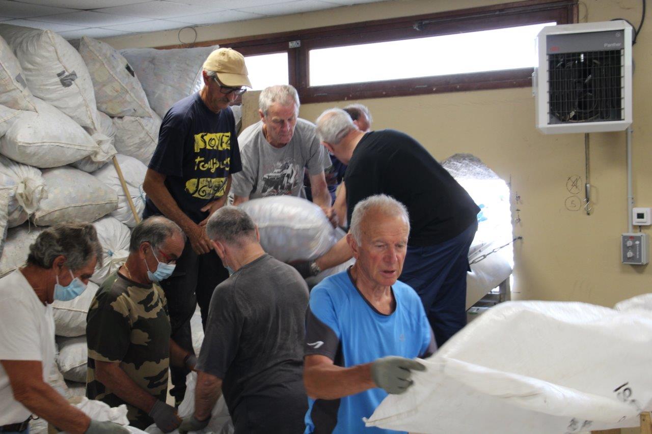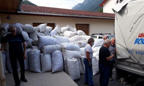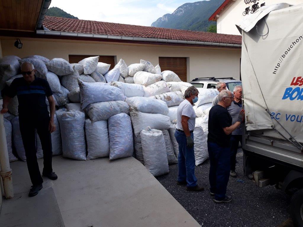 Il a fallu 7 heures de travail intensif rondement mené pour charger la semi-remorque et surtout déstocker 360 sacs triés, entreposés à l’entreprise CHARVIN pour les emmener dans nos locaux de Duingt.
