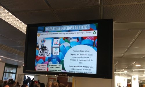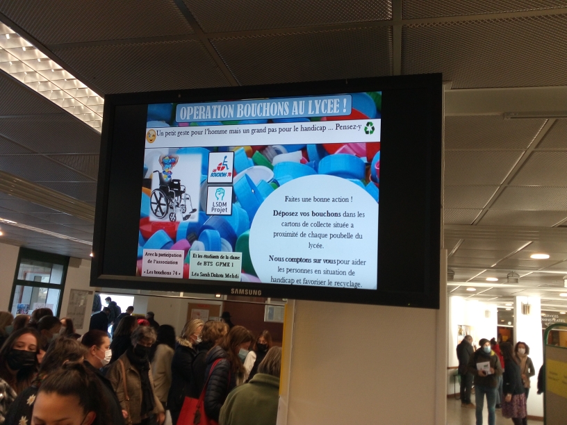 Cette année, se sont Julia et Sofia qui prennent le relai. Elles continuent le travail de Sarah avec laquelle notre bénévole Jean-Louis ont commencé l’année passée la collecte au Lycée. De nombreux professeurs, l’Intendant Général ainsi que le Proviseur sont désormais sensibilisés par notre action. Un gros contenant est depuis peu placé dans l’entrée du Lycée. Une image passe régulièrement sur le circuit télé interne du Lycée (photo). Des messages avec photos passent sur Instagram et Facebook au niveau des élèves.