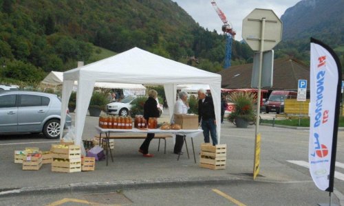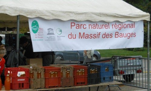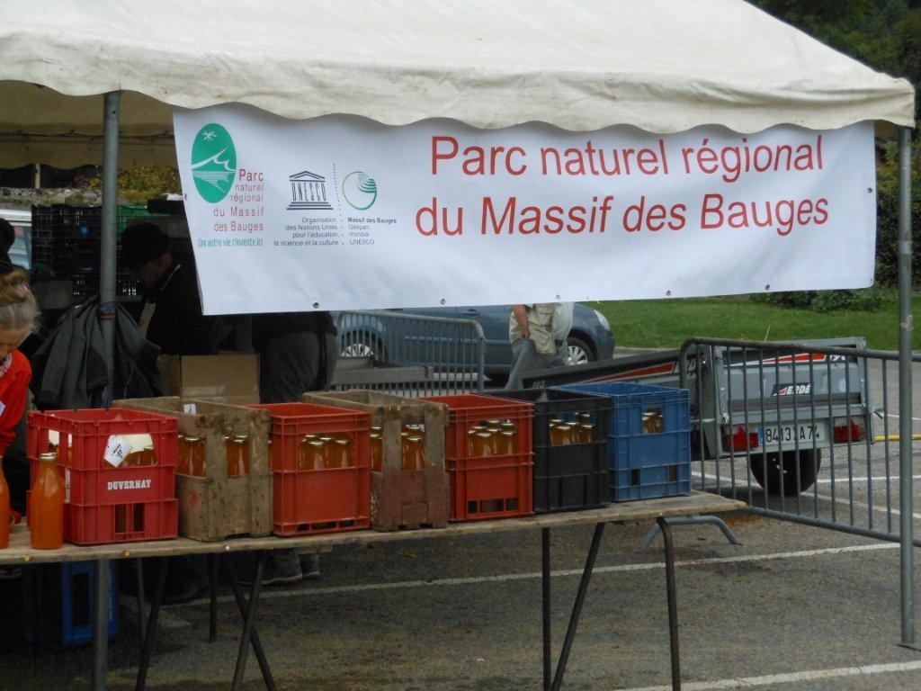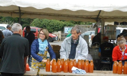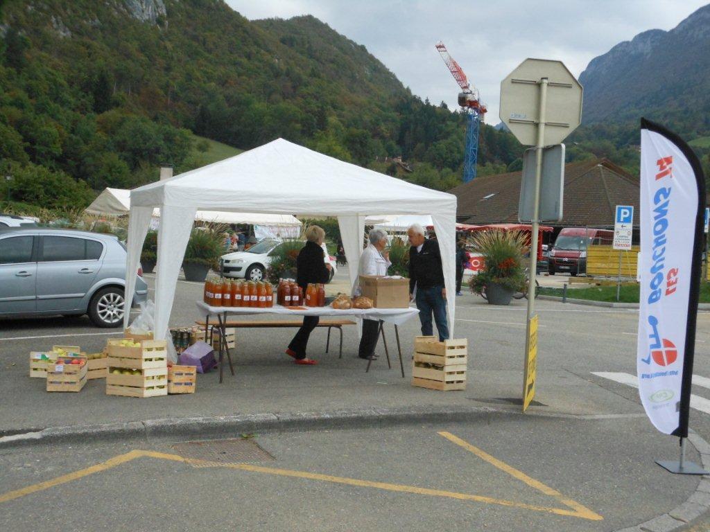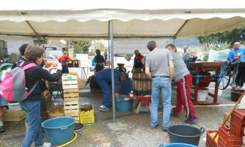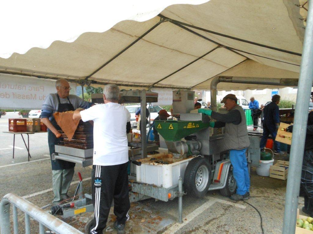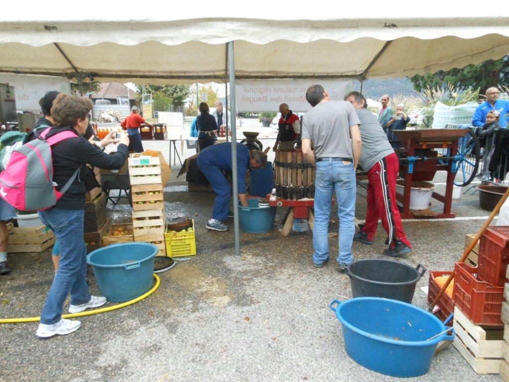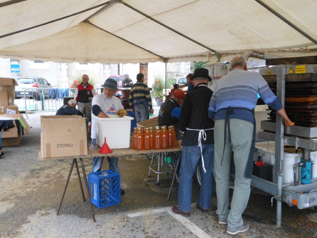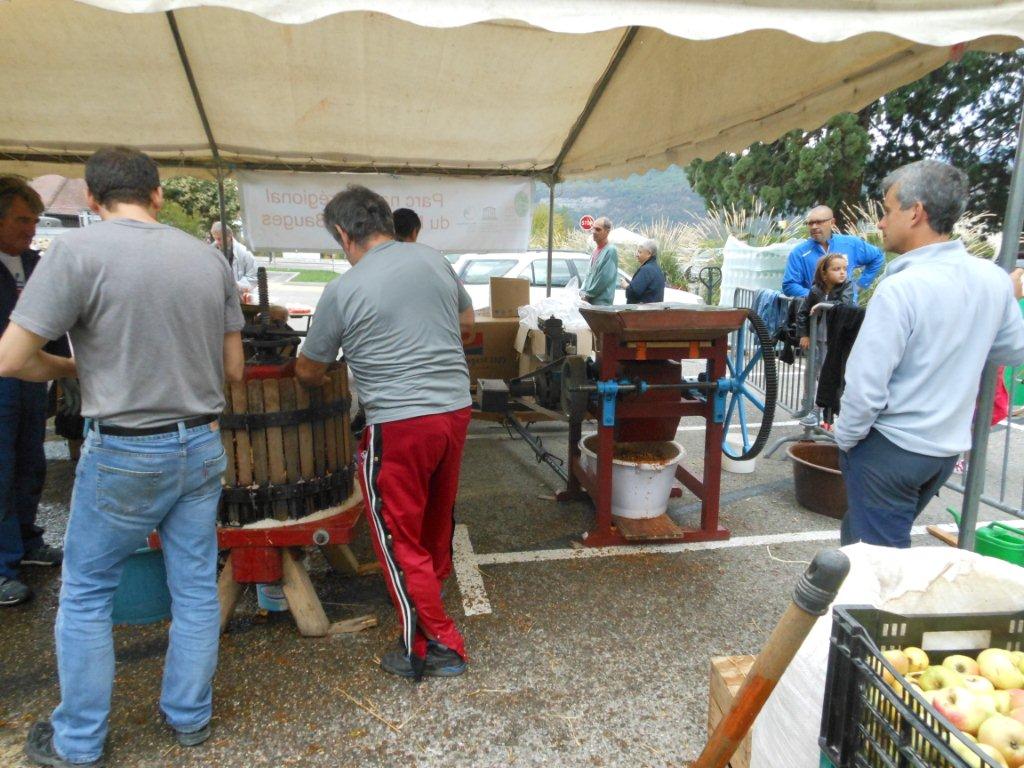 Le samedi matin 05h30, montage du chapiteau abritant la machine du Parc des Bauges qui fait le jus de pomme pasteurisé (jus de pomme chauffé à 80°), du pressoir à vis, de la broyeuse avec son célèbre moteur Bernard (qui tourne comme une horloge), pour le jus de pomme frais.