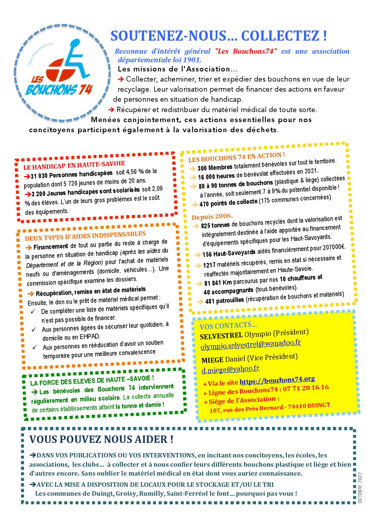 Nous faisons suite à votre entretien avec Daniel MIEGE, Vice-Président de l’Association des Bouchons74.