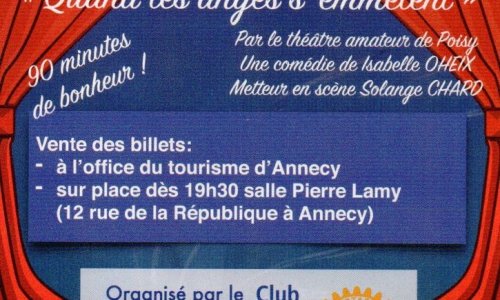 Les places sont à retirer soit à l’Office du tourisme d’ANNECY ou sur place dès 19h30 salle Pierre LAMY à ANNECY (entrée 15€, 8€ pour les étudiants et ados).