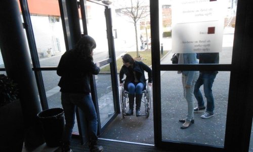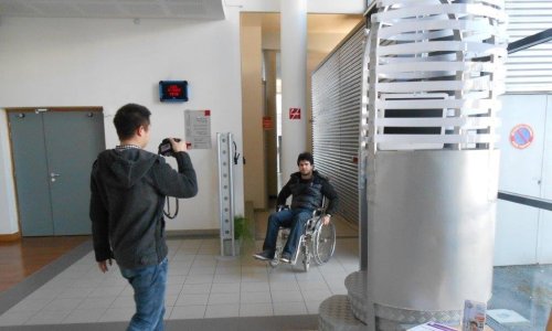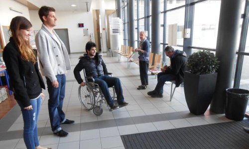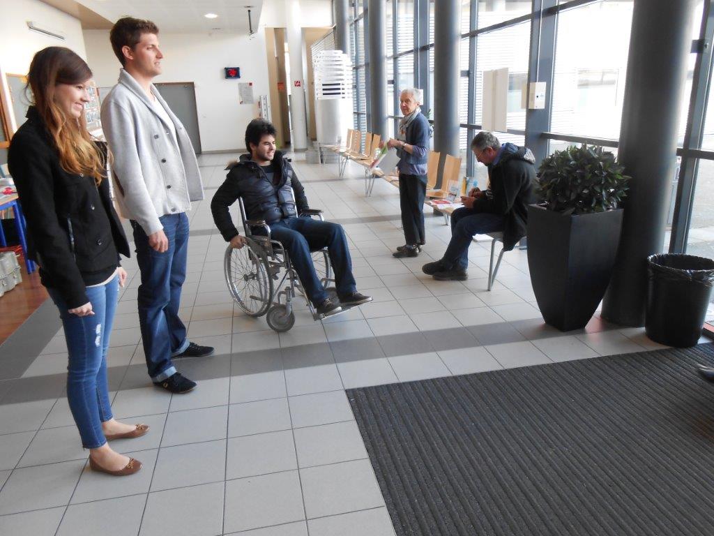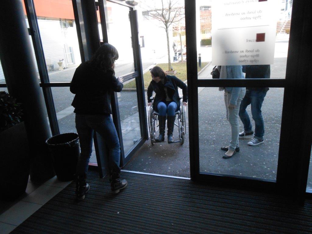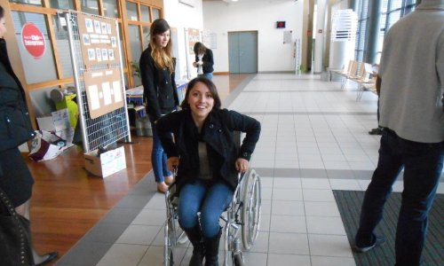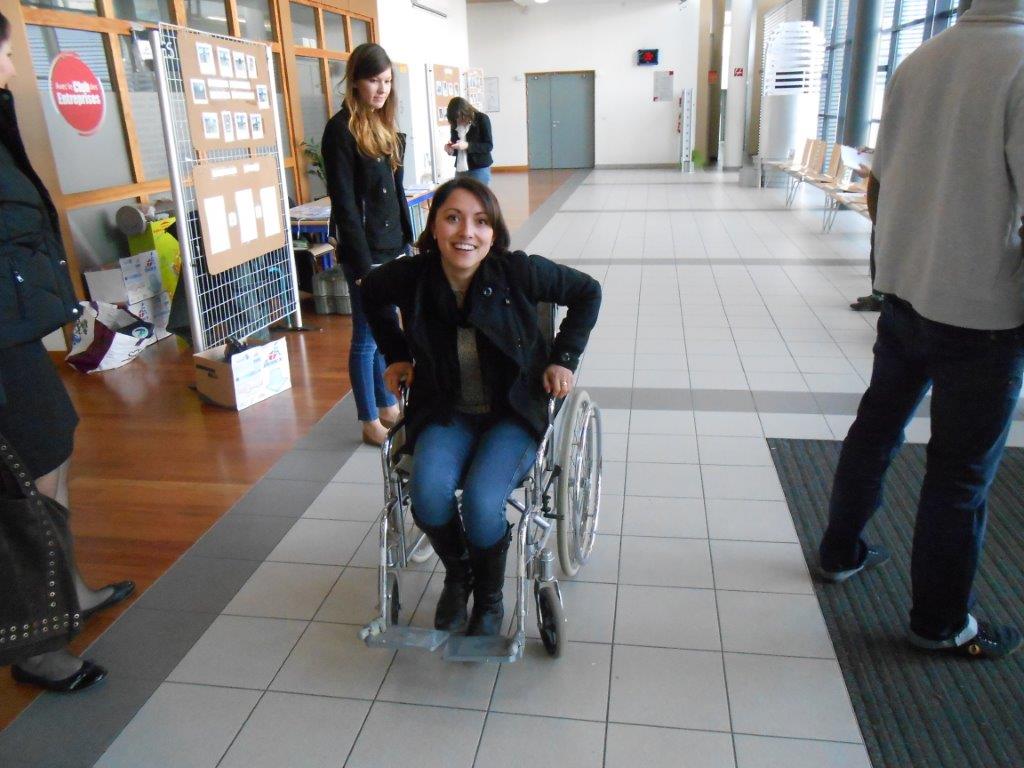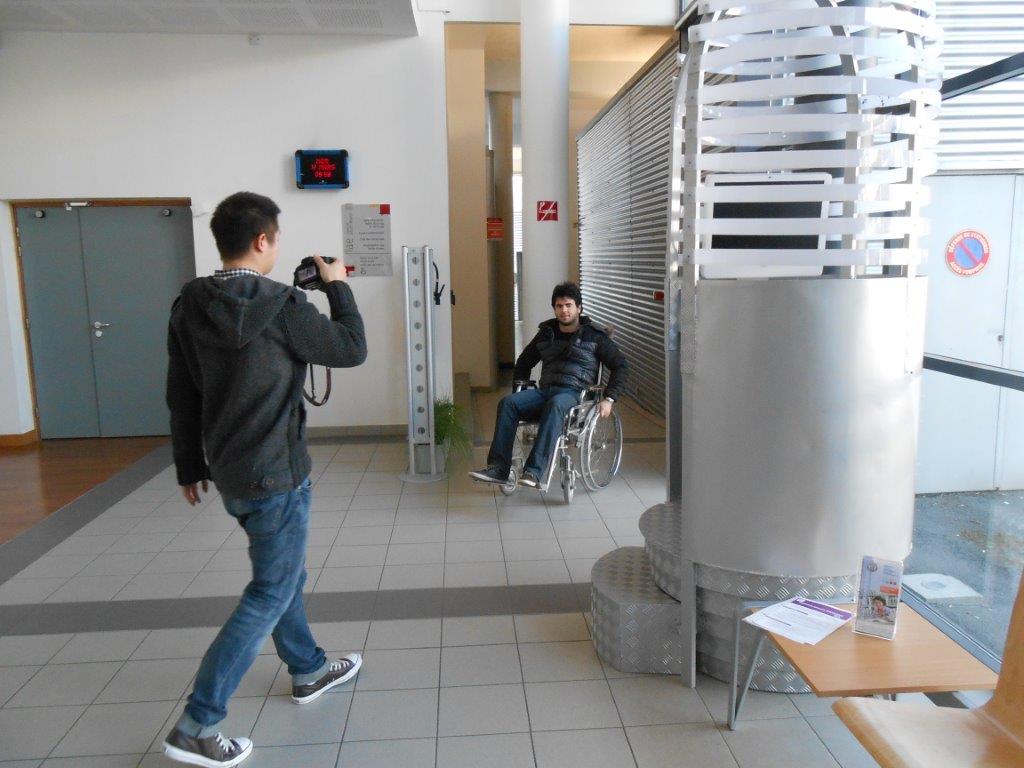 Ces étudiants ont invité leurs camarades à réaliser un parcours en fauteuil roulant au cœur même de l’université (passage de portes, virages, ascenseurs, pans inclinés...), leur permettant de se confronter eux-mêmes aux difficultés à se déplacer, en relevant à l’occasion des anomalies de construction qui compliquent la circulation intérieure des personnes en situation de handicap.