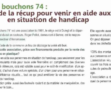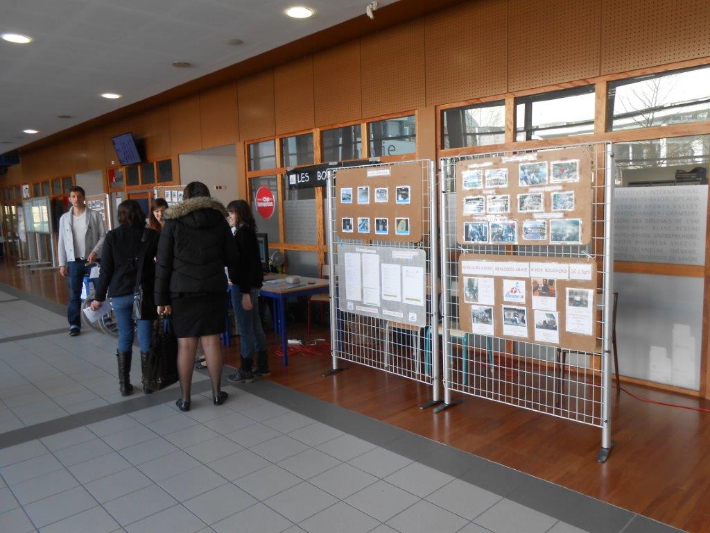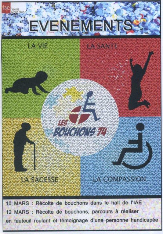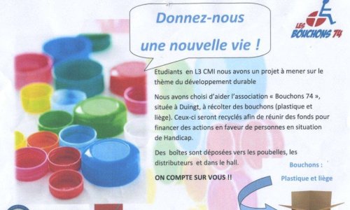 Les panneaux illustrés des Bouchons 74 (aides financières, points de collecte, matériels à disposition, présentation de l’entreprise de recyclage), les affiches et affichettes confec-tionnées par les étudiants organisateurs ont permis de faire connaître l’association départementale, les « Bouchons 74 ».