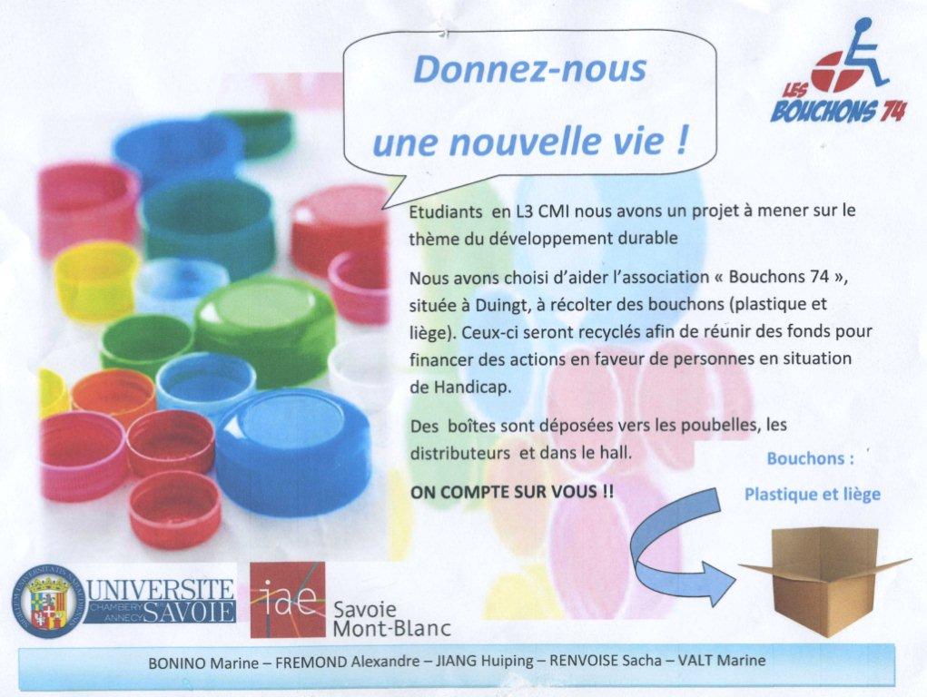 Les « Bouchons 74 » félicitent et remercient les cinq étudiants pour leur remarquable travail et leur engagement exemplaire sur une démarche solidaire, sociale et de développement durable, ainsi que leurs camarades qui s’y sont associés.