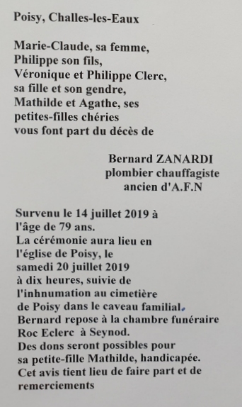 Les obsèques de son papa auront lieu, à POISY, le samedi 20 juillet 2019, à 10h00.