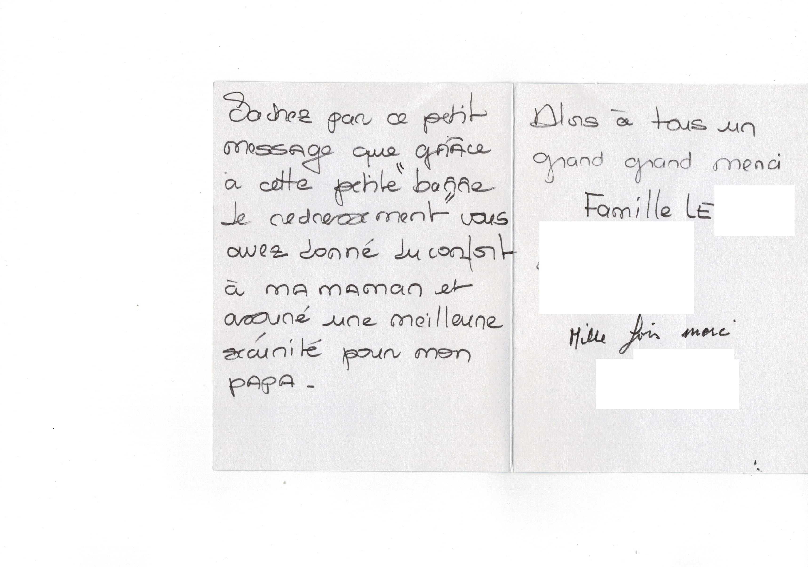 Carte de remerciement reçue par Hélène notre responsable matériel.